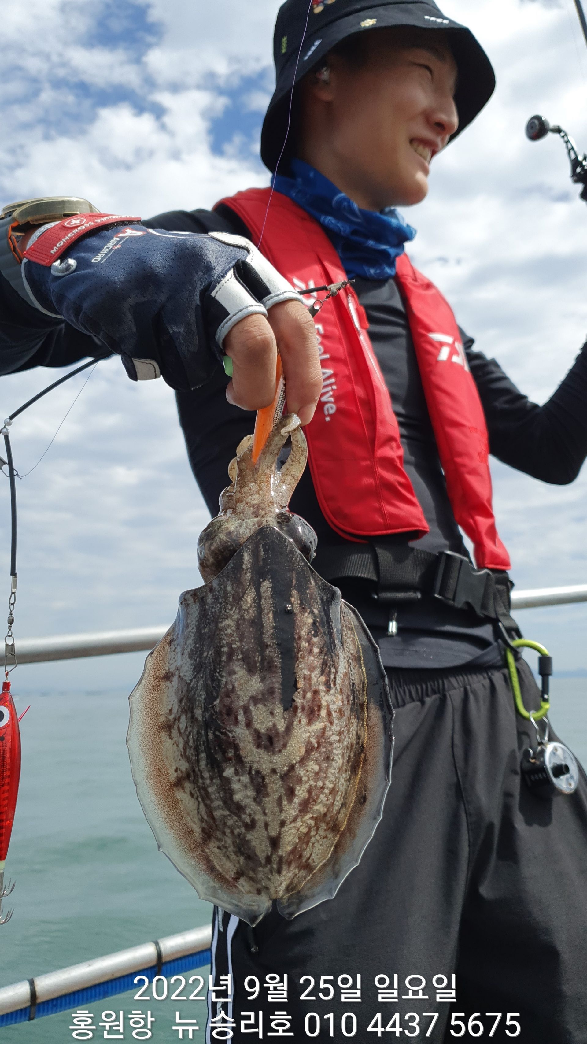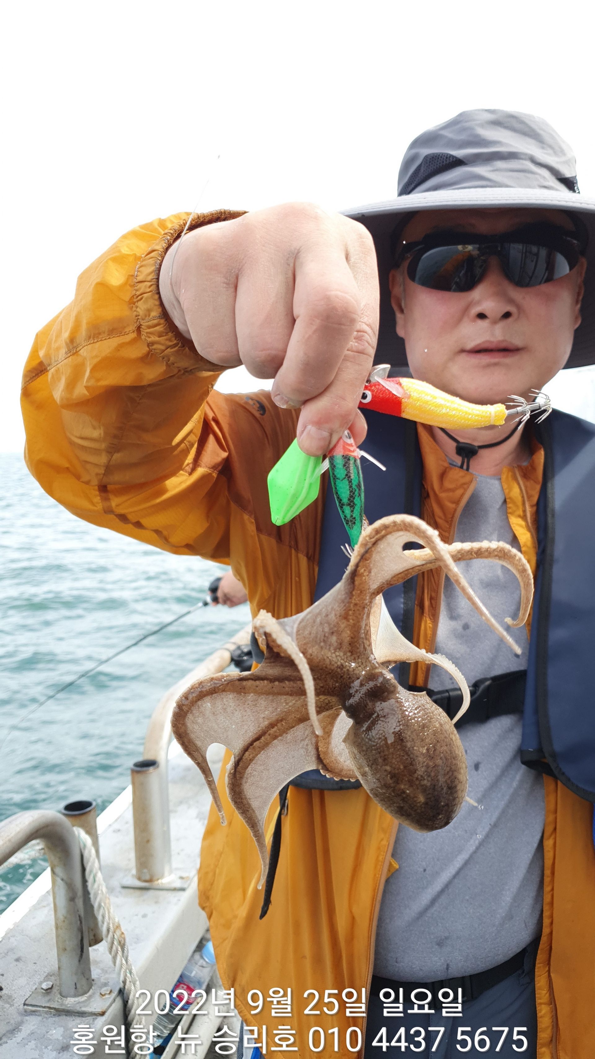 안녕하세요?홍원항 요포낚시입니다!!^^위풍당당^^ 뉴~ 승리호 김선장님 갑오징어&쭈꾸미 망태기는 터질듯 빵~빵~ 한 조황입니다!!이제는 갑오징어도 잘나와 주어서 1인 2망태기는 낚시좀 하신다면 충분한 조황입니다~~오늘은 무임승선한 문어가 선상의 즐거움을 더해주는군요^^^^^^이러한 조황이 홍원항 조황입니다!! 그러하니 조황확인 하시고  쭈꾸미 선비만 받고 갑오징어 낚시를 병행출조 하는 요포낚시로 동참해 주세요!!오늘도 대~박~~ 조황에 수고하신 조사님들 안녕히 가세요!!*****내일(26일) 약한 사릿물 이라서 갑오징어 사냥에 아~주~~ 좋아요!! (동참 하실분은 연락 주세요!!)*****