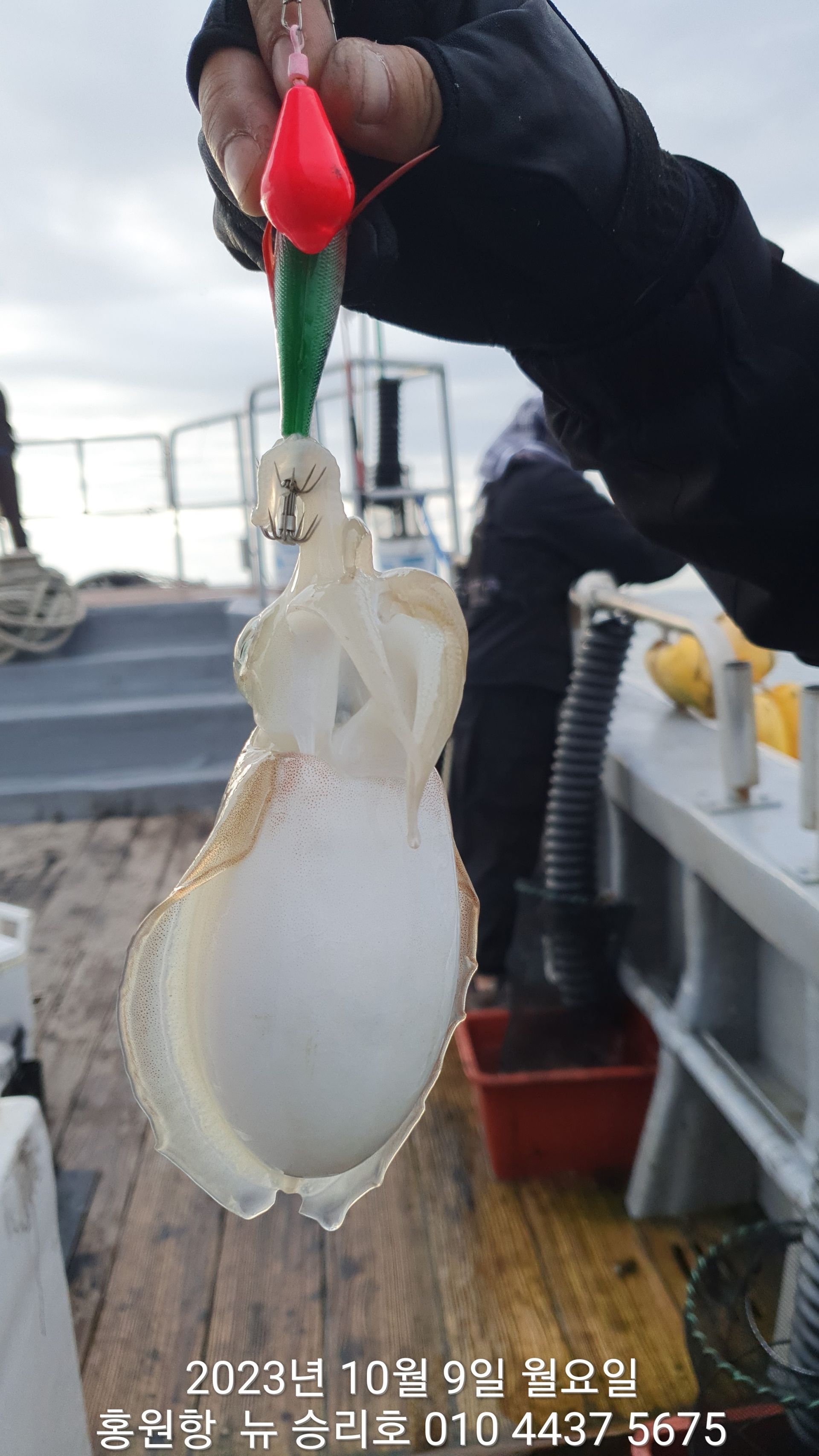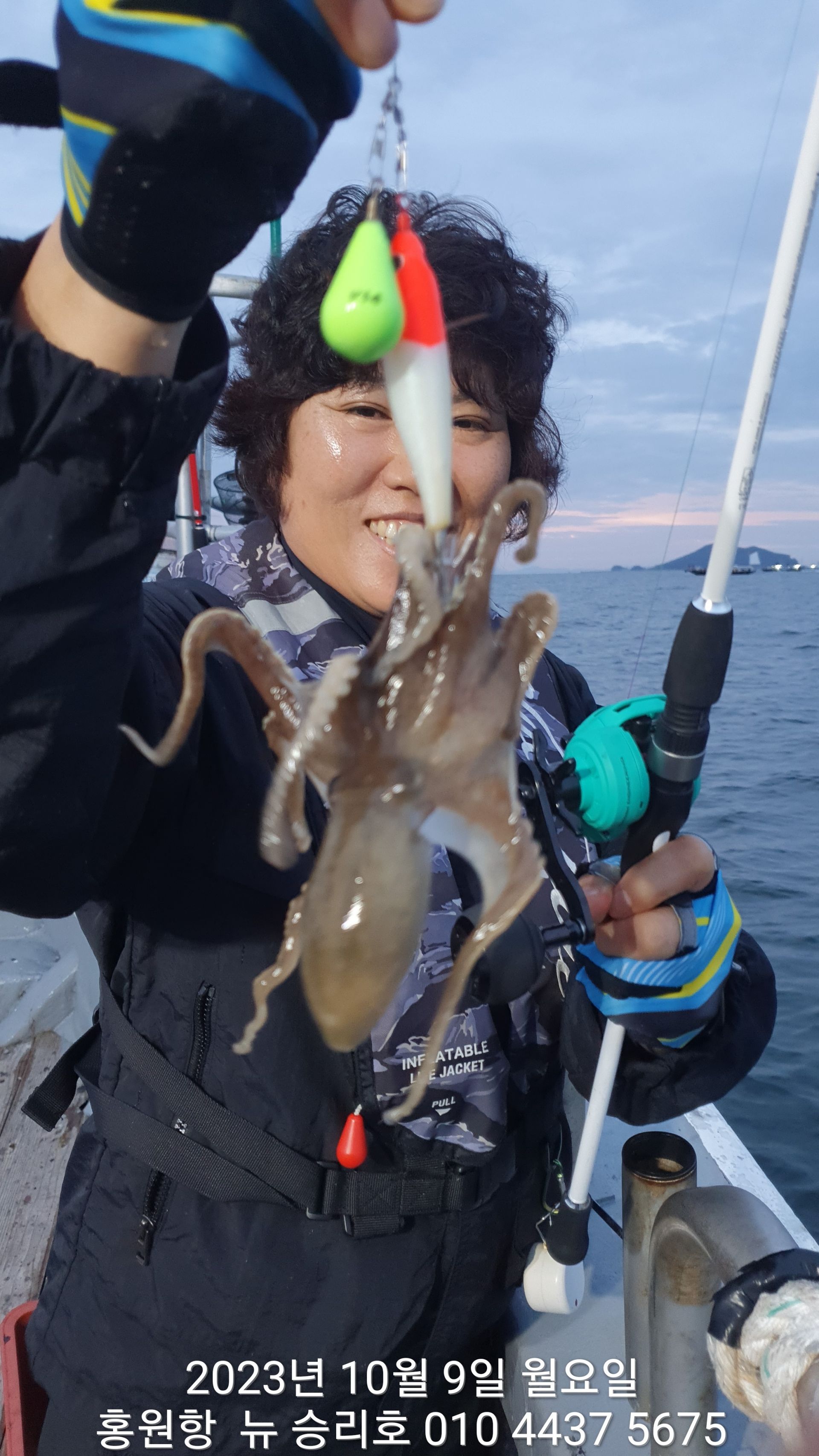 안녕하세요?홍원항 요포낚시입니다!!((뉴~승리호)) 김선장님 과 조사님들  이른 아침부터 좋은 조황으로 모두들 홧~팅~~입니다!!오늘도 김선장님 예상대로 물때에 맞추어 **갑오징어** 먼저공략 이군요~~~조사님들중 오늘도( 여성 ) 조사님들의 선전 하시는군요^^^^우짜든 이러한 호조황으로 오늘도 대~박~~을 기대 합니다!! ***중식 : 커피: 캔음료: 생수:기타음료: 컵라면:지퍼팩(봉지) 써비스***    ~~긴급~~ 내일/10월10일(황금 물때) 자리여유 있으니 동참 하실분은 연락 주세요!!저희 요포선단은 항상 최고 보다는 최선을 다해 보답 하겠습니다!!^^^^^ 저희 요포선단은 쭈꾸미 선비로 갑오징어 낚시를 **병행** 해드립니다!!^^^^^^