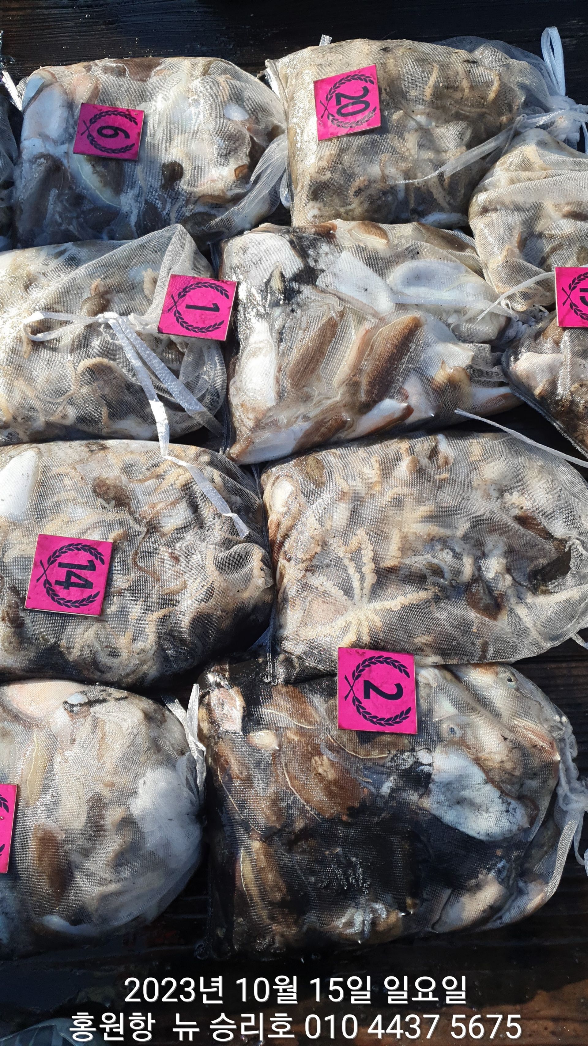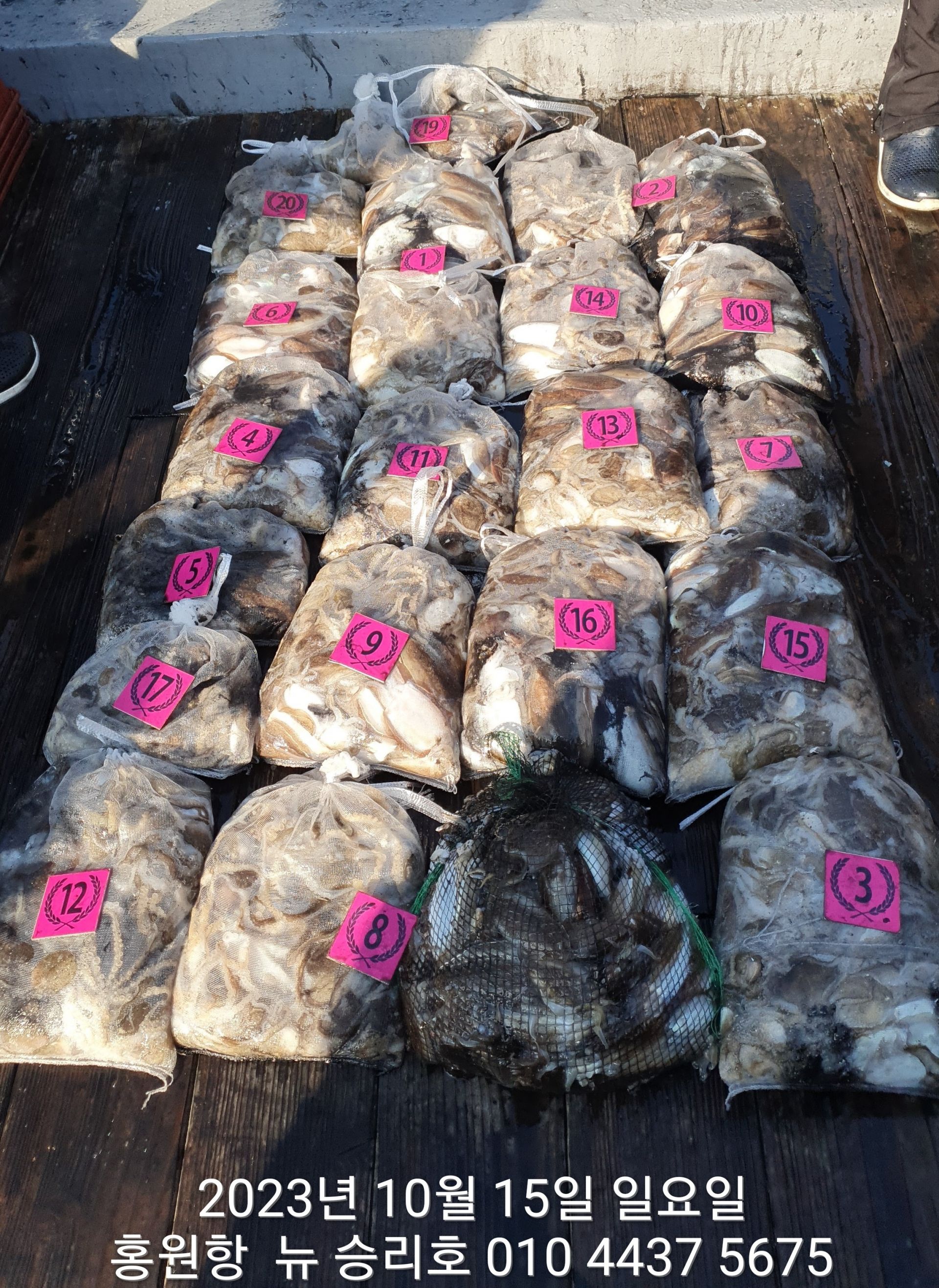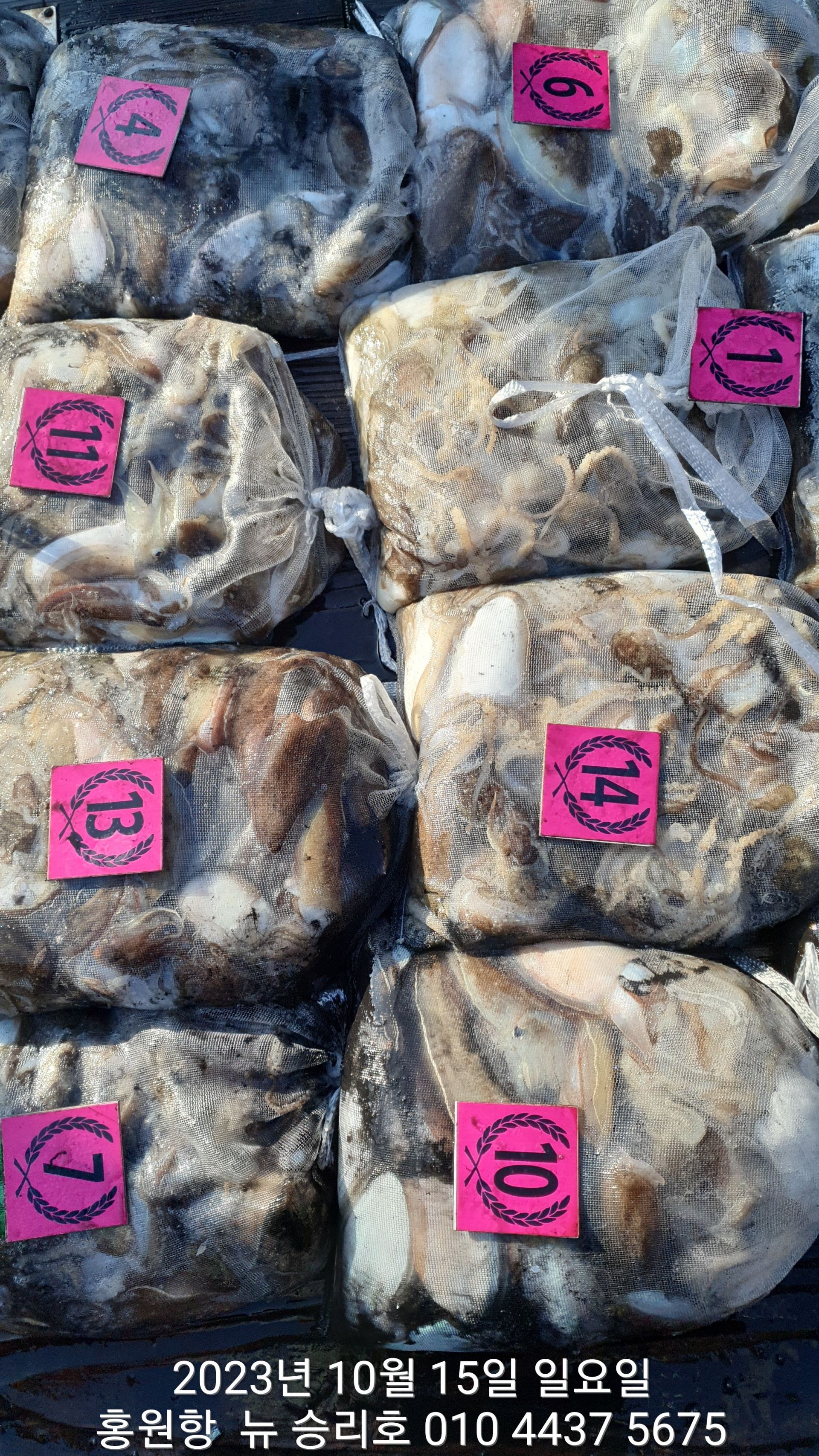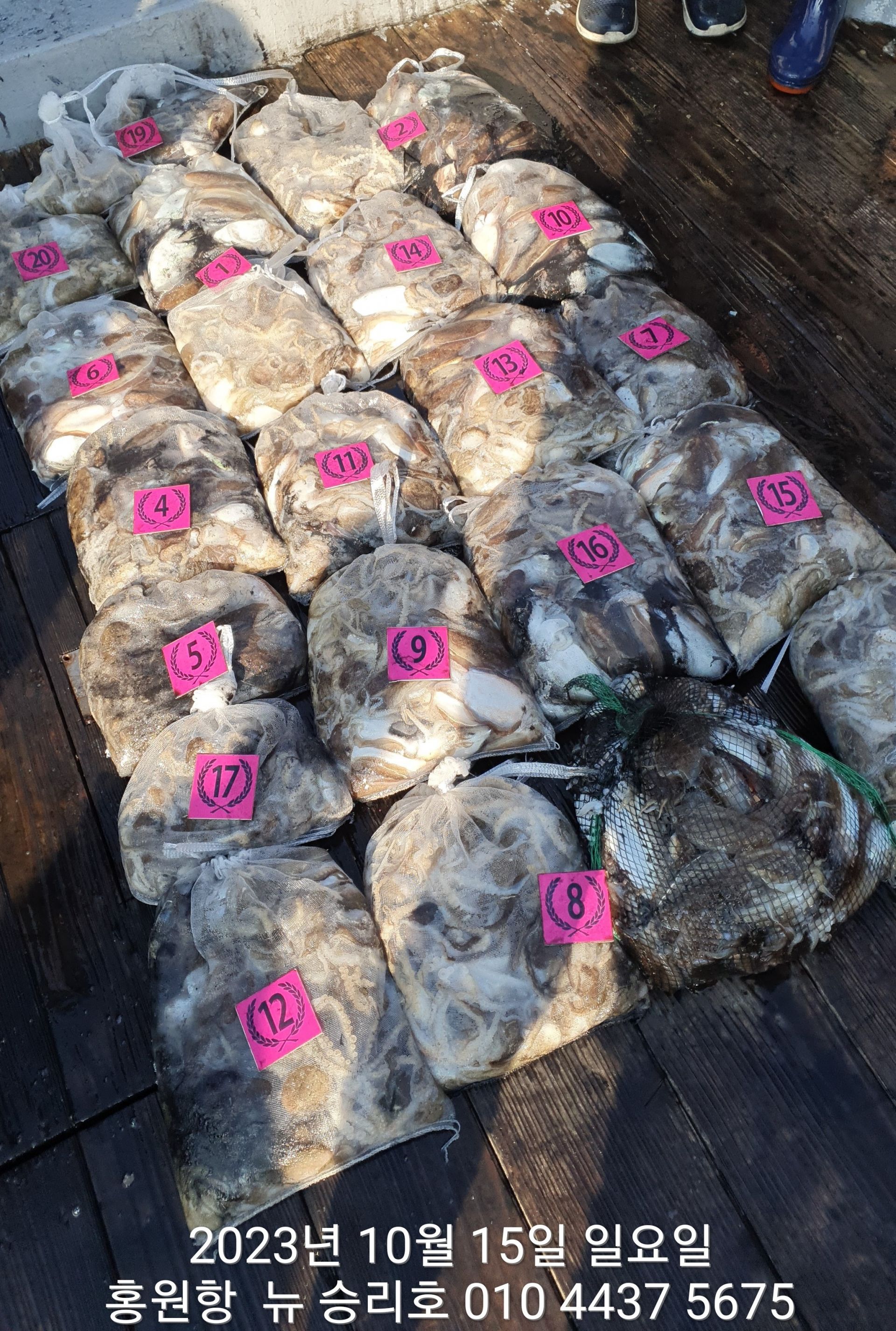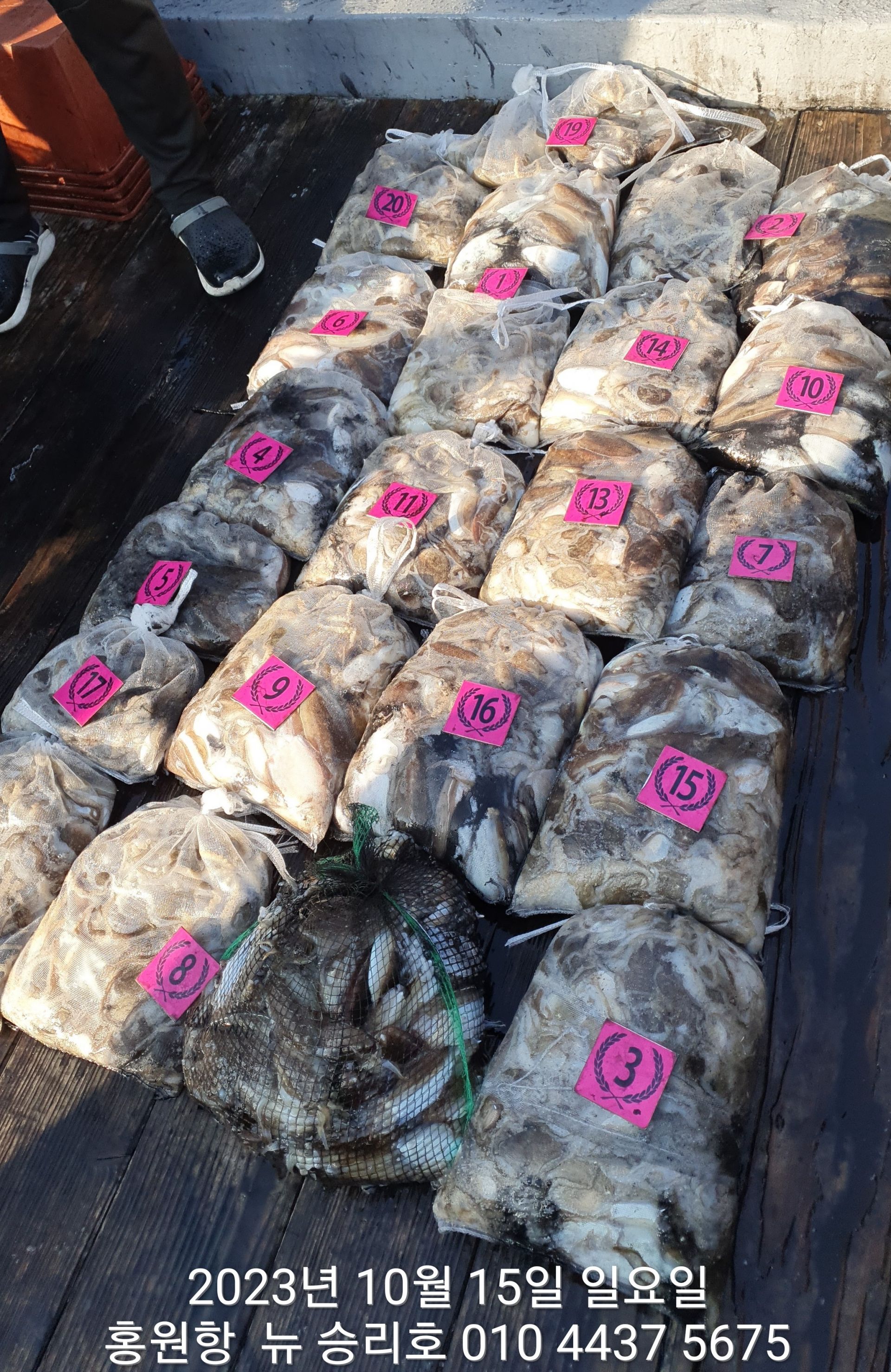 안녕하시세요?홍원항 요포낚시입니다!!((뉴~승리호)) 오늘은 10분의 조사님과 홧~팅~~하신 어부들의 조황 입니다!!10분승선에 망태기 숫자는 는 허~얼~~1인 2망태기도 보통이 넘는 완~죤~~ 대박 입니다!!이러한 조황이 ~~~홍원항~~~ ^^위풍당당^^ ((뉴~승리호)) 조황입니다^^^^^^대~박~~ 조황에 수고하신 조사님들 안녕히 가시고 다음 기회에 뵙겠습니다!! ***중식 : 커피: 캔음료: 생수:기타음료: 컵라면:지퍼팩(봉지) 써비스***    ~~긴급~~ 내일/13일(갑이사냥/황금 물때) 자리여유 있으니 동참 하실분은 연락 주세요!!#15일(일요일)도# 단체팀 취소로 잔여석 있으니 바다에 보관해둔 고기 가져가세요!! 저희 요포선단은 항상 최고 보다는 최선을 다해 보답 하겠습니다!!^^^^^ 저희 요포선단은 쭈꾸미 선비로 갑오징어 낚시를 **병행** 해드립니다!!^^^^^^