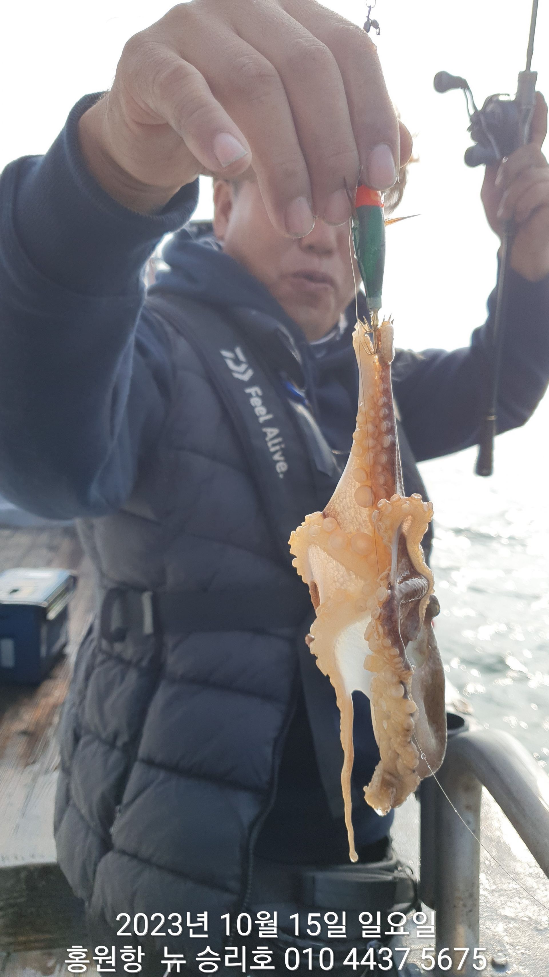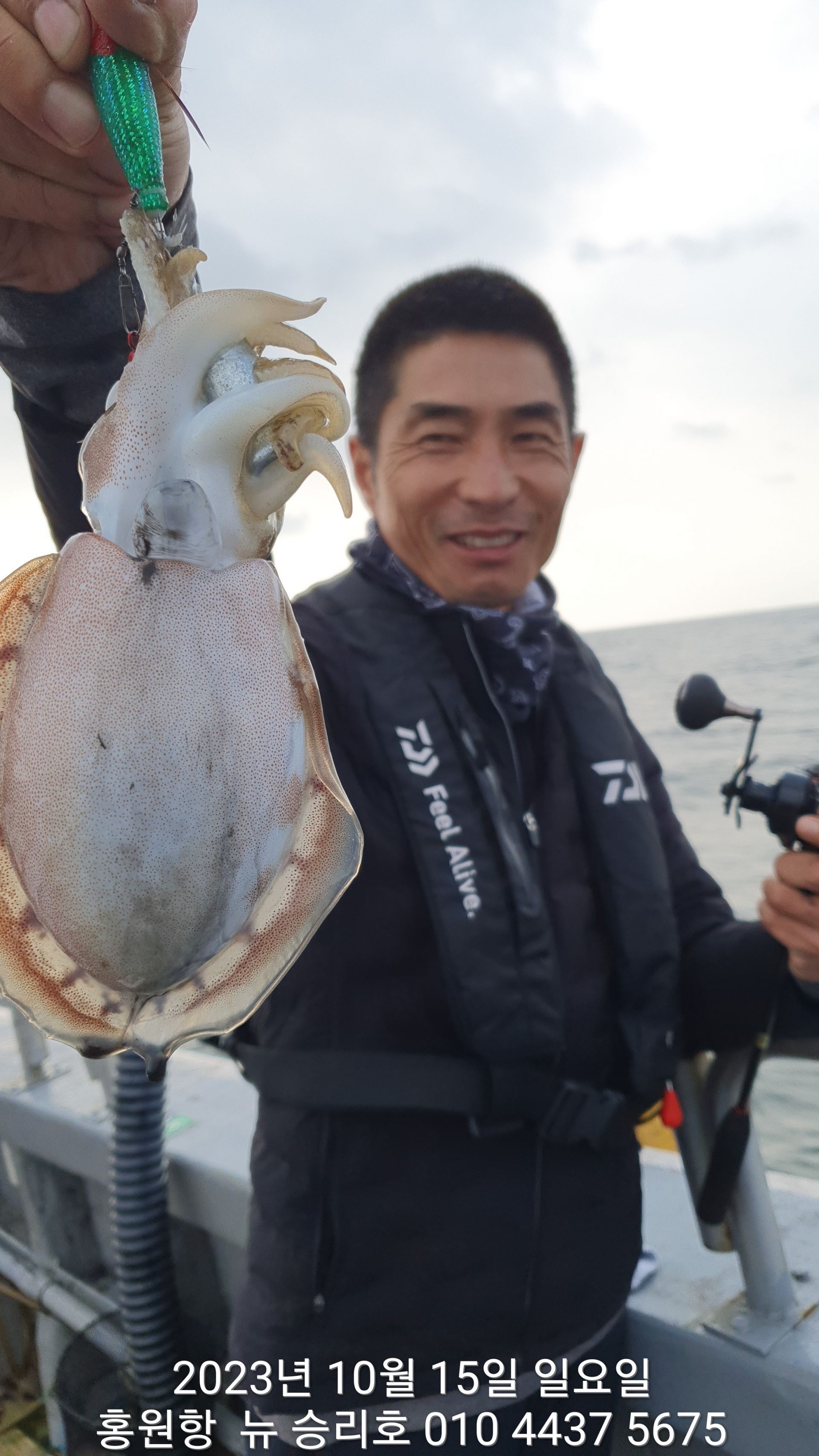 안녕하세요?홍원항 요포낚시입니다!!오늘도 뉴~승리호 김선장님 이른 시간부터 홧~팅~~ 조황입니다!!요즘 계속해서 살어나는 호조황에 오늘도 남은시간 홧~팅~` 하셔서 대~박~~ 조황을 기대합니다!!쭈꾸미 낚시는 남/여/노/소 누구라도 쉽게 하실수있는 장르입니다!!~(그러니 가족과 함께 또는 연인과함께  직장 동료와 함께 하루를 힐~링~~하고 가세요!!)~그래도 부족한 부분은 요포낚시와 베타랑 선장님들이 모두를 도와 드리겠으니 망설이지 마시고 도전 하세요!! ***중식 : 커피: 캔음료: 생수:기타음료: 컵라면:지퍼팩(봉지) 써비스***    ~~긴급~~ 내일/15일(갑이/황금 물때) 자리여유 있으니 동참 하실분은 연락 주세요!저희 요포선단은 항상 최고 보다는 최선을 다해 보답 하겠습니다!!^^^^^ 저희 요포선단은 쭈꾸미 선비로 갑오징어 낚시를 **병행** 해드립니다!!^^^^^^